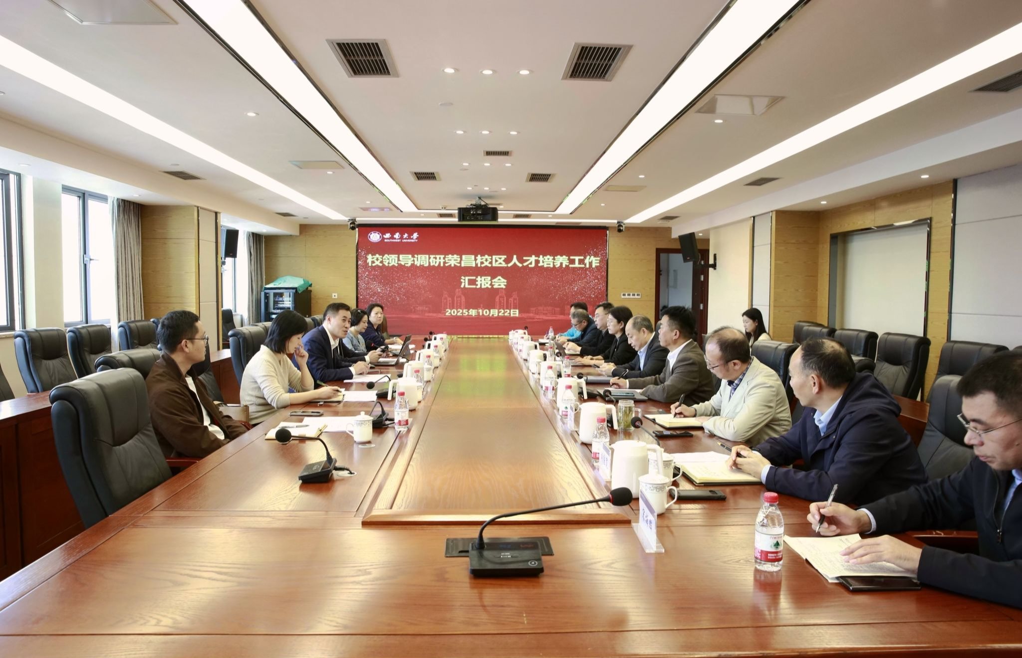 10月22日下午,学校党委常委、副校长白显良带队到荣昌校区调研指导人才培养工作。党政办公室、本科生院(招生办公室)、研究生院等职能部门有关负责人,创新创业学院(含弘学院、智慧农业学院)院长,荣昌校区党工委 管委会、商贸学院、动物科学技术学院、动物医学院、水产学院等在荣各单位负责人参加调研座谈会。