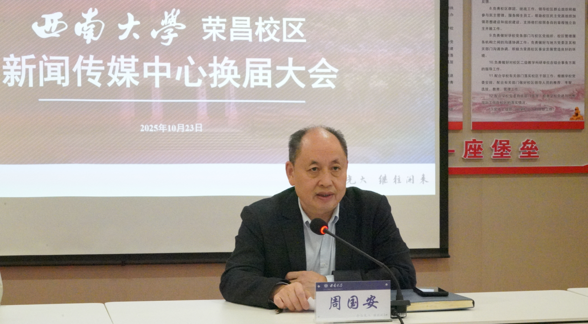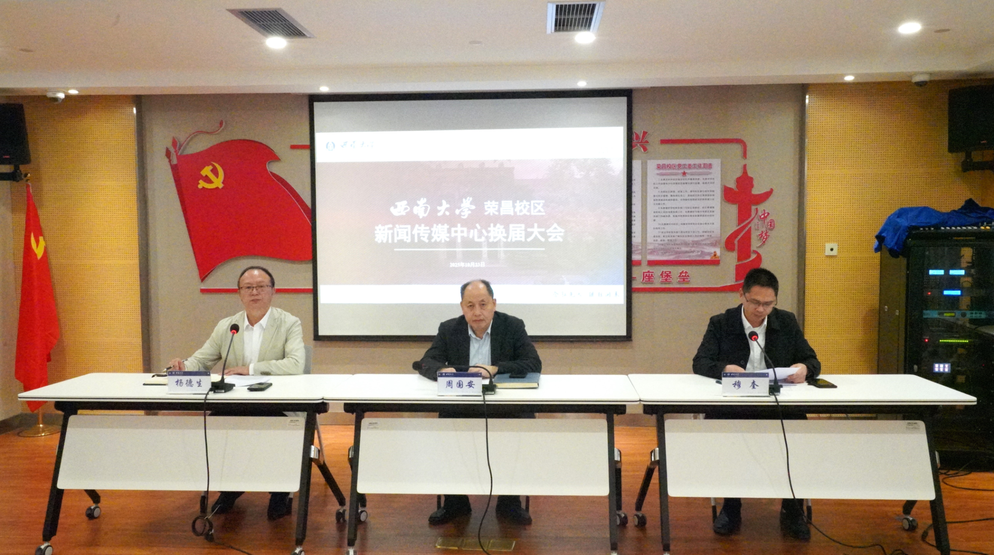 10月23日中午,西南大学荣昌校区新闻传媒中心换届大会在7A704会议室顺利举行。西南大学荣昌校区党工委书记、管委会主任周国安,校区党工委副书记、纪工委书记、新闻传媒中心主任穆奎,校区综合办相关负责老师及新闻传媒中心全体成员参加大会。大会由校区综合办主任、新闻传媒中心常务副主任杨德生主持。