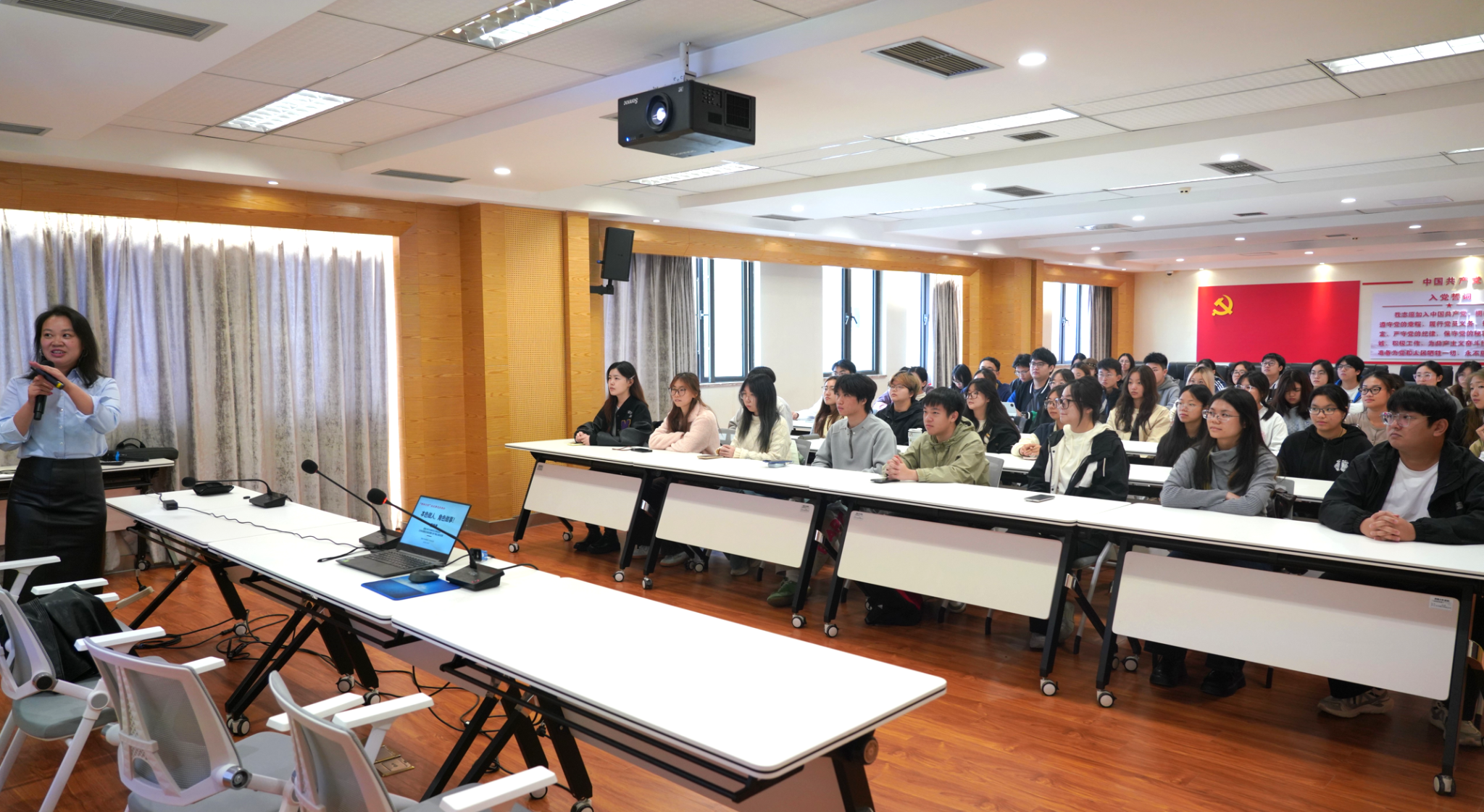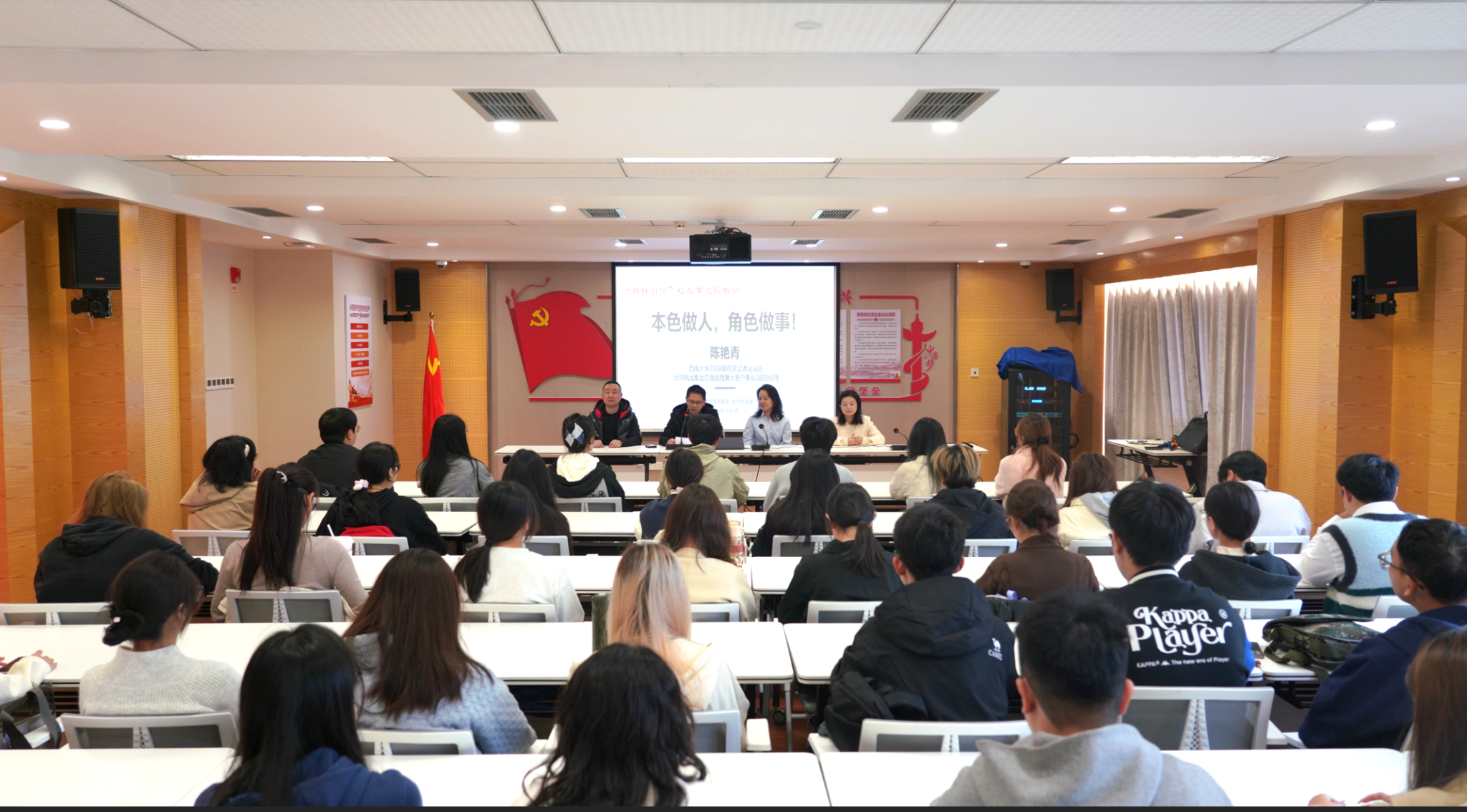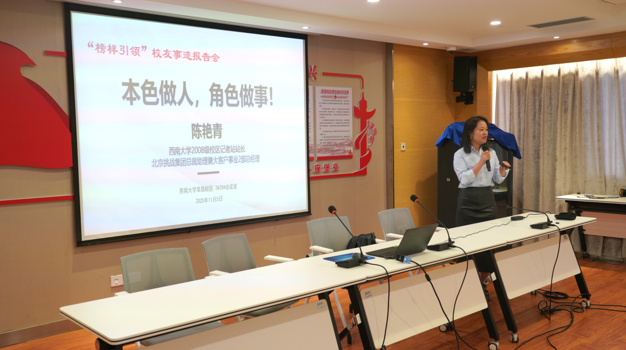 为深入打造“荣之光”党建品牌,落实“励志故事大分享”建设路径,11月5日中午,荣昌校区党工委特邀优秀校友、曾经在荣昌校区新闻传媒中心担任学生干部的挑战集团高管陈艳青女士重返母校,与新闻传媒中心为主体的师弟师妹们进行了一场题为《本色做人,角色做事》的面对面交流“榜样引领校友事迹报告会”。此次活动作为“先锋讲堂”与“青春榜样”巡讲的重要一环,旨在以榜样的力量激励在校生砥砺前行。报告会由荣昌校区党工委副书记、纪工委书记穆奎主持。