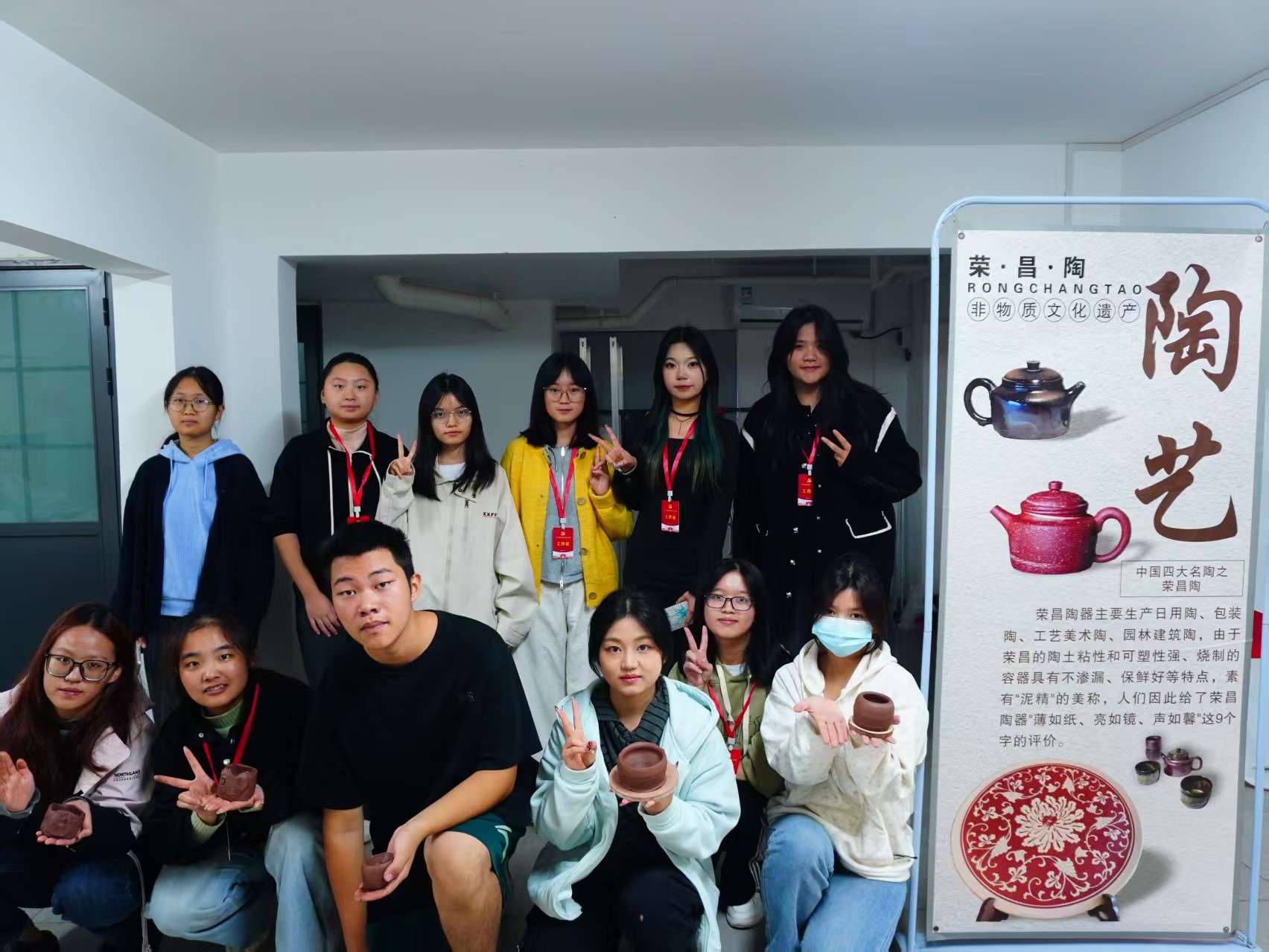 本次活动聚焦国家级非物质文化遗产——荣昌陶制作技艺,通过非遗传承人的现场讲解与指导,引导学生亲身体验揉泥、拉坯等传统工艺环节。荣昌陶作为中国四大名陶之一,历经千年传承发展,形成了"红如枣、薄如纸、亮如镜、声如磬"的独特艺术风格。同学们在动手实践中不仅加深了对“形、质、韵”传统美学理念的理解,更将现代创意融入作品创作,实现了非遗文化的活态传承与创新表达。
