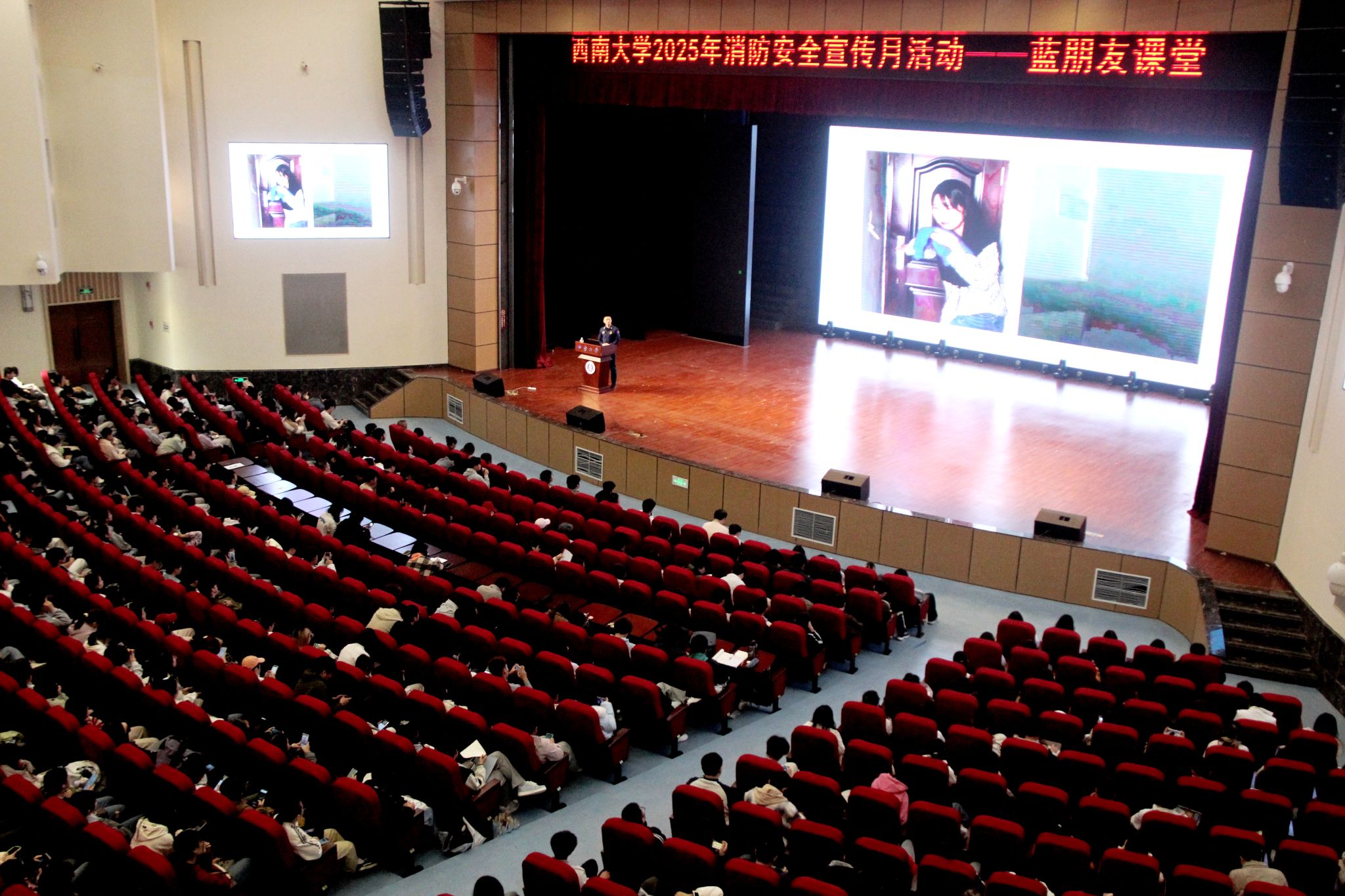 11月14日下午,西南大学2025年消防安全宣传月系列活动之“蓝朋友课堂”在荣昌校区荣光礼堂开讲,特邀荣昌区昌元消防救援站的一线消防员夏净尘老师从火场实战的视角为在校大学生带来了一堂全面生动的消防安全课,现场800多名大学生参加学习。