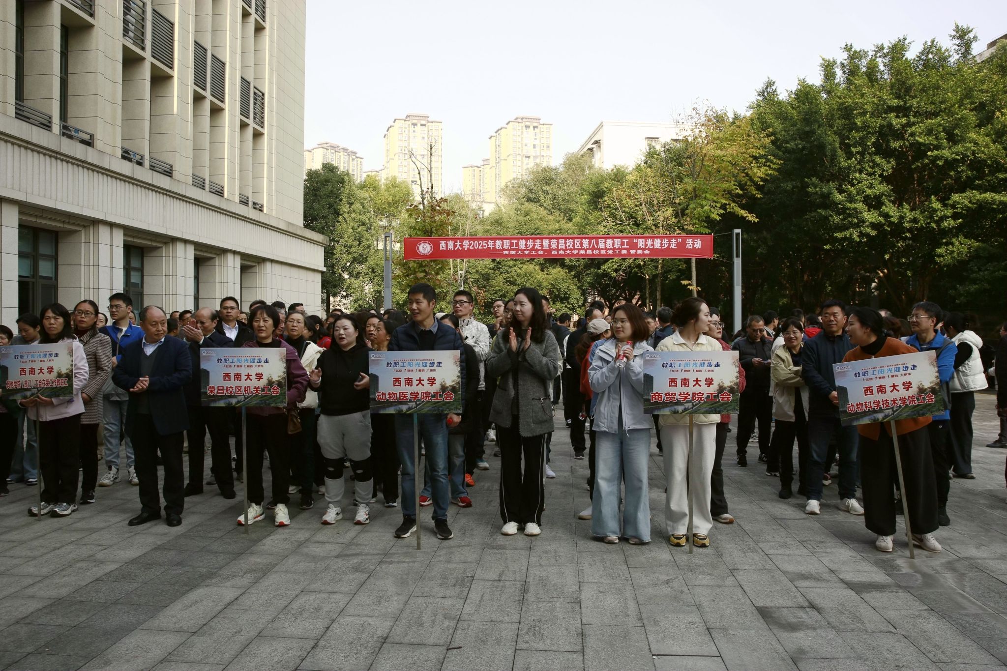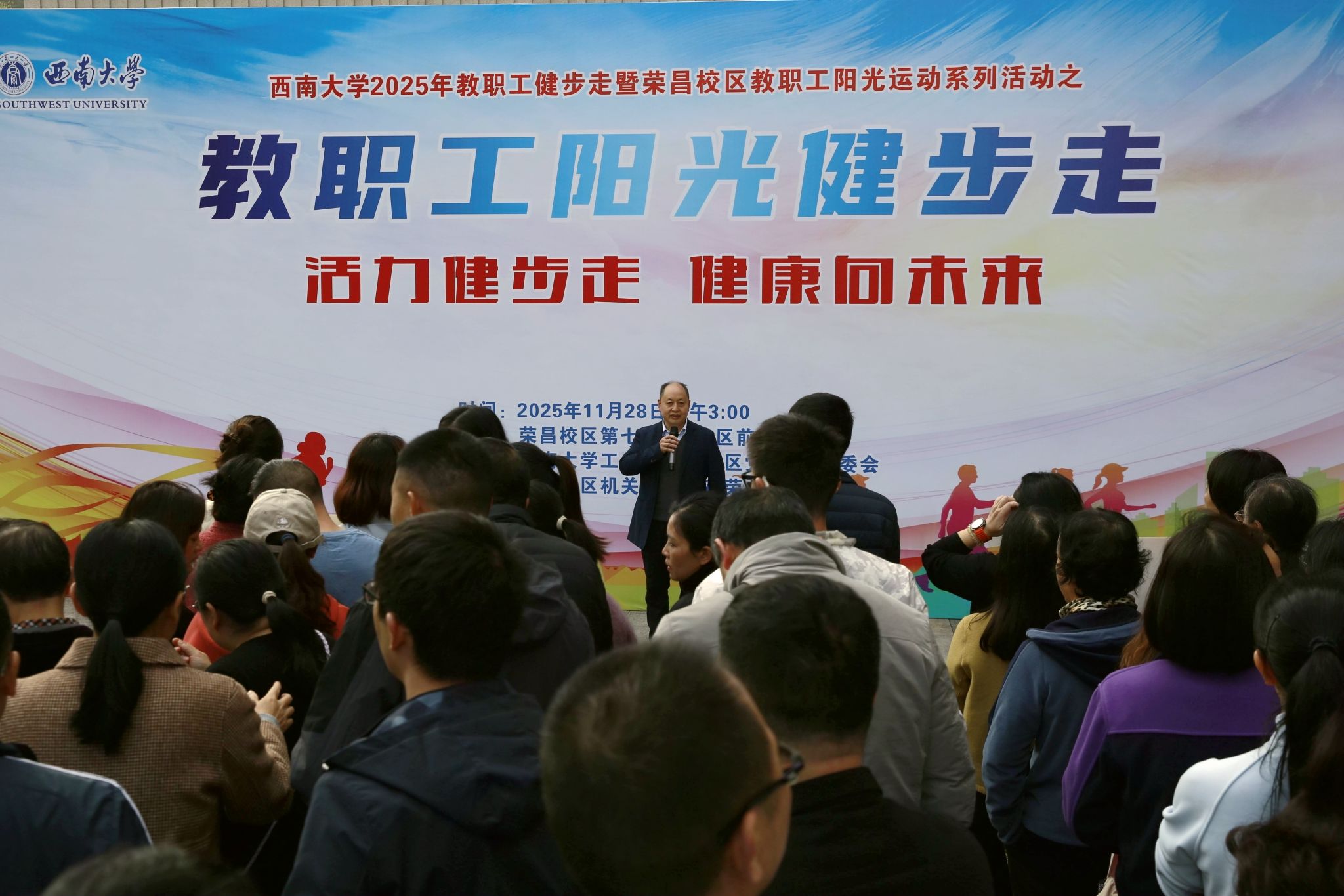 为将全民健身融入校园日常生活,为教职工注入健康活力、培育常态化锻炼习惯,11月28日下午,西南大学2025年教职工健步走暨荣昌校区第八届教职工 “阳光健步走” 活动在荣昌校区开幕。本次活动由学校工会与荣昌校区党工委、管委会主办,荣昌校区机关工会及在荣学院工会承办,校区机关、在荣学院及其他学院(部门)在荣工作的会员职工近300人踊跃参与活动。