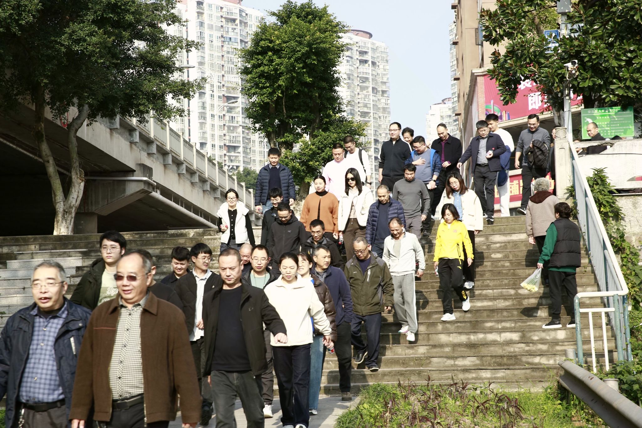 启动仪式后,教职工们身着轻便运动装,精神抖擞地从第七教学楼整装出发。值得一提的是,此次活动为50岁以上年龄段教职工设计了相对短一点的线路供选择,让教职工在适度锻炼中沐浴阳光、感受自然风景。行进途中,有的三五成群并肩畅谈,脚步声与笑声在河畔回荡;有的独自行进享受静谧,不时驻足拍下眼前的美景;遇到脚步稍缓的同事,还会主动伸手鼓劲,“加油!前面的风景更棒!”一句句鼓励,让整条步道都充满了温馨。