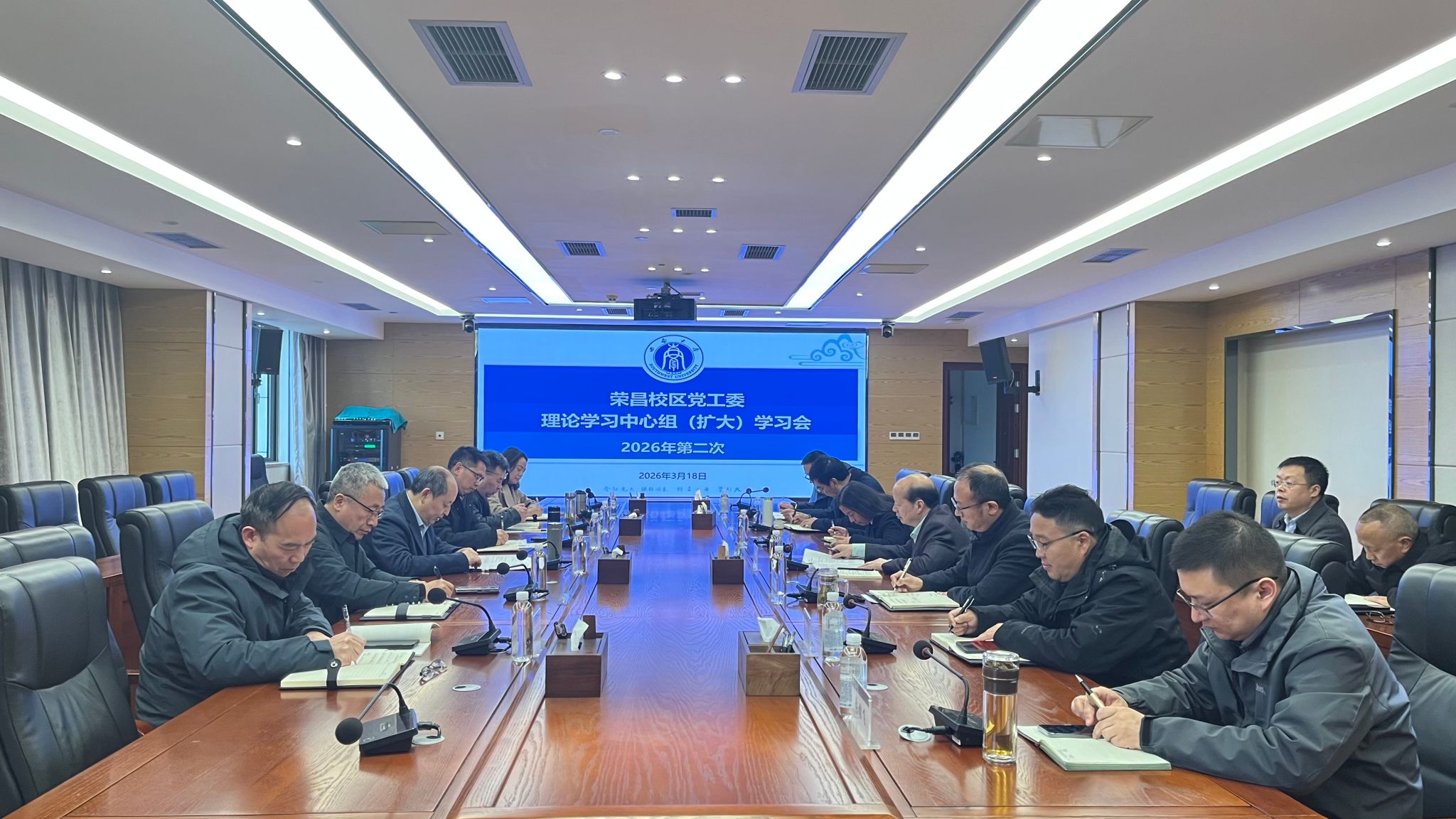 3月18日上午,校区党工委第二次理论学习中心组(扩大)学习会在7A804会议室举行。党工委管委会班子成员、机关管理部门处级干部、机关党支部书记参加,荣昌校区党工委书记、管委会主任周国安主持。
