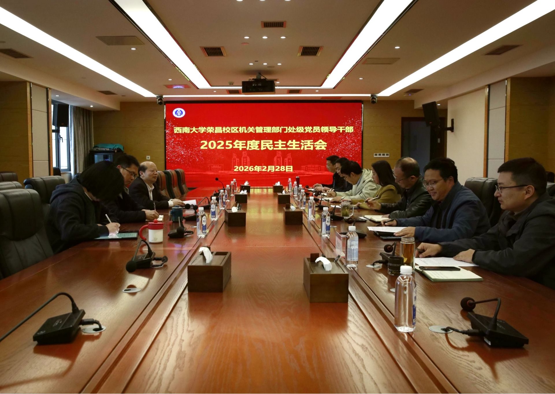 根据《中共中央纪委机关 中共中央组织部关于开好2025年度县以上党和国家机关党员领导干部民主生活会的通知》(组通字〔2025〕39号)文件精神,以及学校关于处级党员领导干部2025年度民主生活会的工作要求,按照西南大学荣昌校区党工委、管委会及机关管理部门处级党员干部2025年度民主生活会工作方案的安排,荣昌校区党工委、管委会机关管理部门处级党员领导干部民主生活会于2026年2月28日下午在校区7A804举行。此次会议由荣昌校区机关党总支书记周克勇同志主持,校区党工委副书记、纪工委书记穆奎同志,综合办公室副主任李卿璐同志作为党工委督导组列席会议,7名处级党员领导干部参加会议。