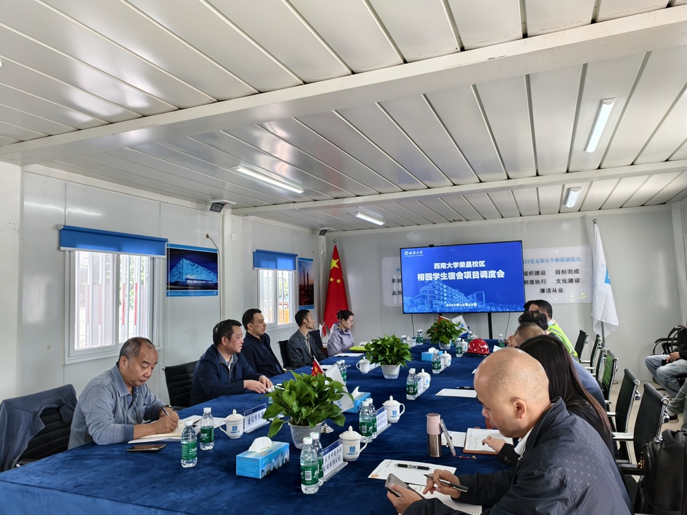 榕园学生宿舍(荣昌校区)项目调度会在施工现场会议室召开。会议听取了初步设计单位的技术交底汇报,设计联合体就当前设计方案进行了成果汇报,并提出需协调解决的问题。总承包单位汇报了施工进度、资源调配及现场管理情况;各方就施工图深化、材料选型与成本控制等进行研讨。