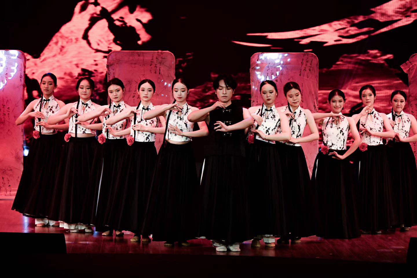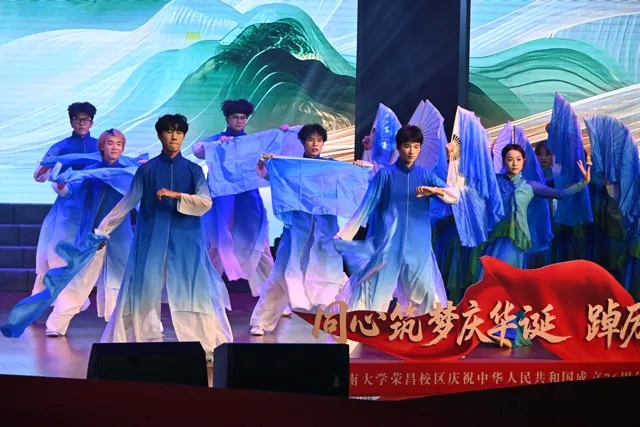 晚会以“初心如炬·云起映山河”“旌旗漫卷·盛世正风华”“薪火相传·同心续荣光”三个篇章串联,将回首岁月、家国情怀与展望未来、青春活力巧妙融合。校区教职工艺术团率先登场,带来舞蹈《灯火里的中国》。教师们的翩翩舞姿,勾勒出寻常人家的温馨日常让现场观众瞬间沉浸在国泰民安的美好图景中。西南大学荣昌校区大学生艺术团的《云起华章》尽显民族文化的独特魅力。校团委选送的《创想实验室》则颠覆想象,把AI、科技等新潮概念搬上舞台,展现出西大学子的创新风采。《大河颂》压轴登场,歌声如长江黄河般奔涌,舞姿似泰山昆仑般巍峨,象征着五千年中华文明的传承与奔腾不息。晚会上的每一个节目,都生动体现了新时代青少年的青春与活力。