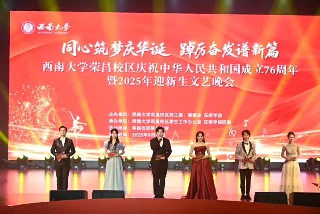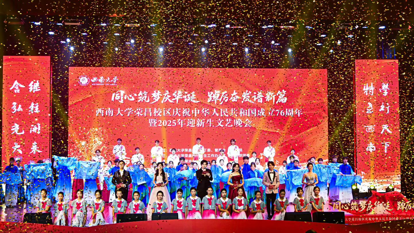 9月26日晚,西南大学荣昌校区荣光礼堂内座无虚席,掌声雷动。一场名为“同心筑梦庆华诞,踔厉奋发谱新篇”的2025年迎新生文艺晚会在此盛大启幕,共同庆祝中华人民共和国成立76周年。校长、党委副书记王进军,党委常委、副校长廖晓衡等领导嘉宾与2025级新生及师生代表齐聚一堂,共享这场融合青春活力与家国情怀的视听盛宴。