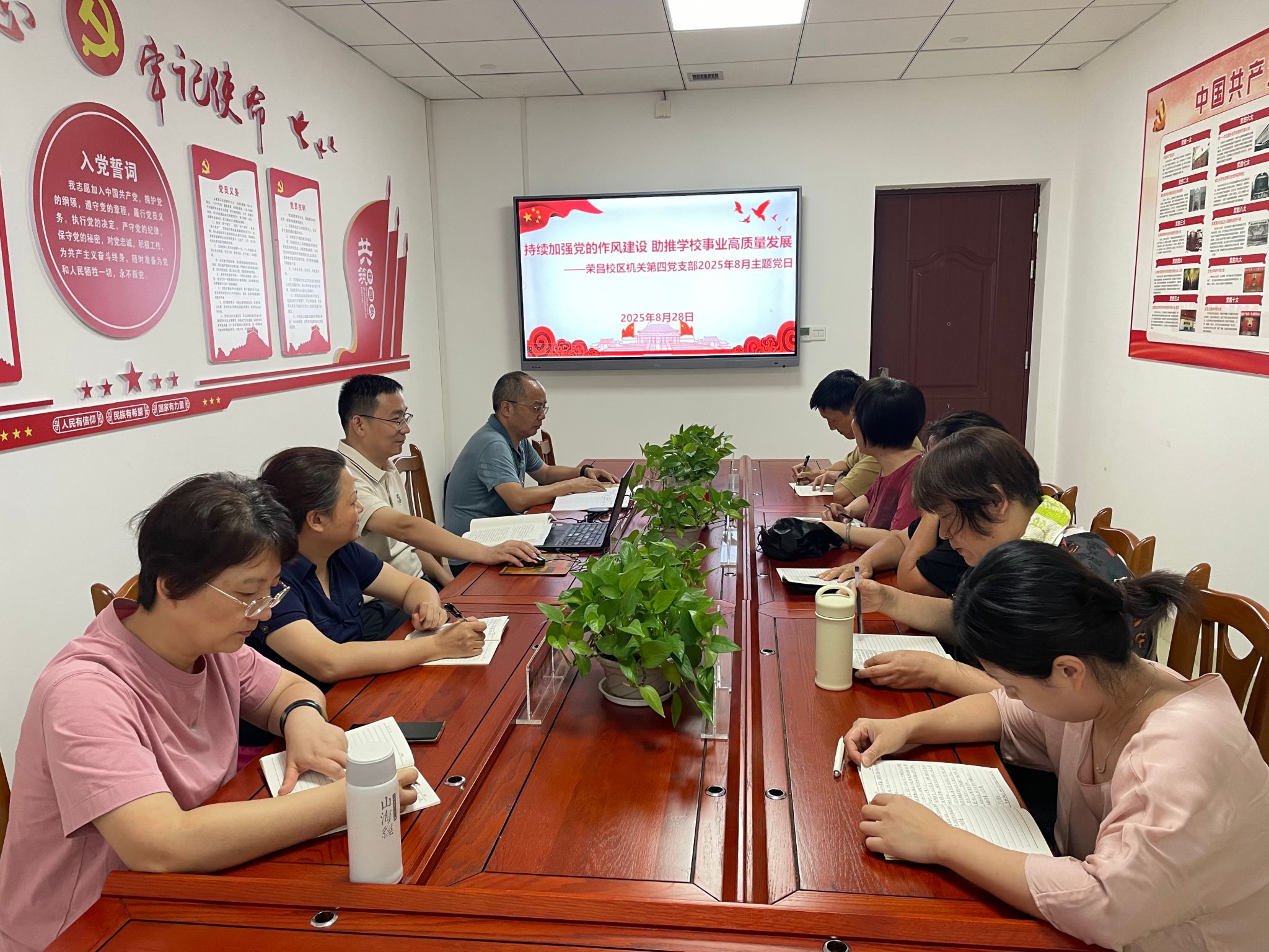 8月28日下午,荣昌校区机关第四党支部组织开展“持续加强党的作风建设 助推学校事业高质量发展”主题党日活动,支部全体党员参加。活动通过理论学习、实践研学、民主议事等环节,进一步强化党员党性修养,推动党建工作与业务工作深度融合。活动由支部书记丁恩俊主持。