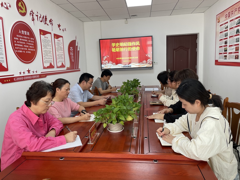 2025年9月24日上午,荣昌校区机关第四党支部召开了“学史明纪强作风 砥砺前行担使命”2025年党员教育培训第二次集中大课交流研讨会。支部党员结合授课内容、本职工作、自身实际,围绕政治引领、业务攻坚、强化服务意识、密切联系群众、提升办事效能等进行了研讨。