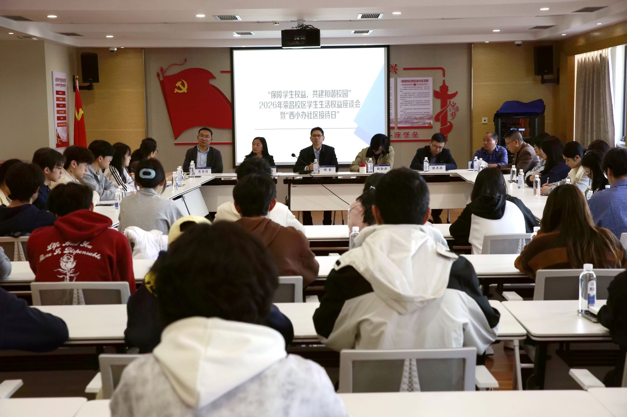 为切实抓好在校大学生生活权益工作,树立和践行“以学生为中心”的正确政绩观,依托学生权益问题反馈平台广泛了解学生诉求,建立为学生办实事常态化工作机制,3月26日下午,荣昌校区2026年学生生活权益座谈会暨“西小办社区接待日”在7教704会议室召开。校区党工委副书记、纪工委书记穆奎出席会议并讲话。荣昌校区综合办、学工办、保卫办、图书馆、后勤集团荣昌校区服务中心相关负责人,以及在荣学院的部分学生代表参加了会议。会议由学校党委学生工作部副部长、学生处副处长、荣昌校区学生工作办公室主任罗艳芬主持。